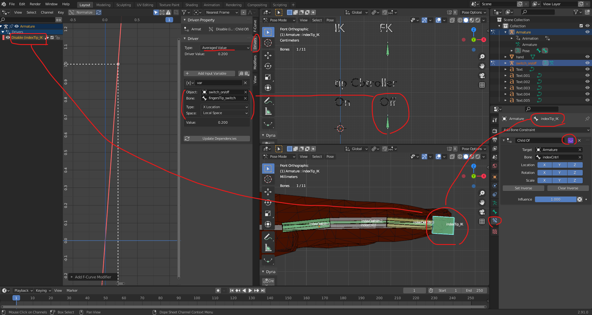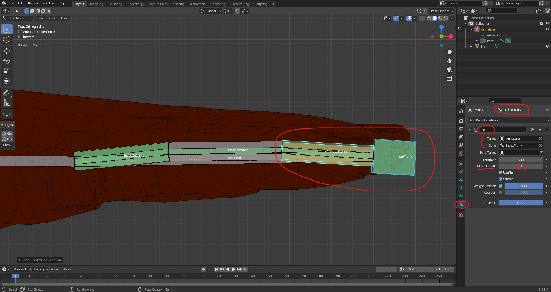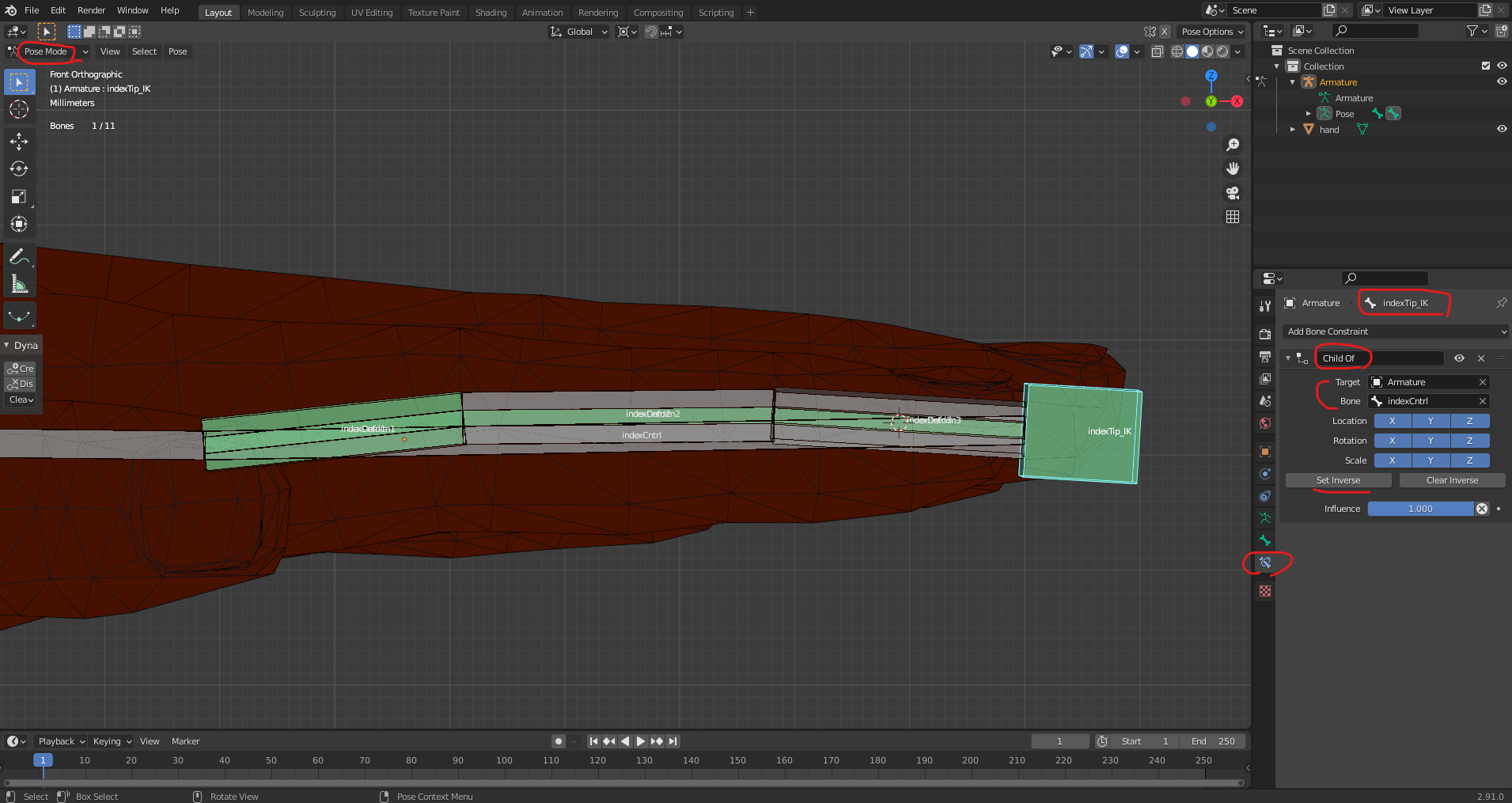 indexTip_IK 본의 Child Of 제약을 비활성으로 만듭니다.