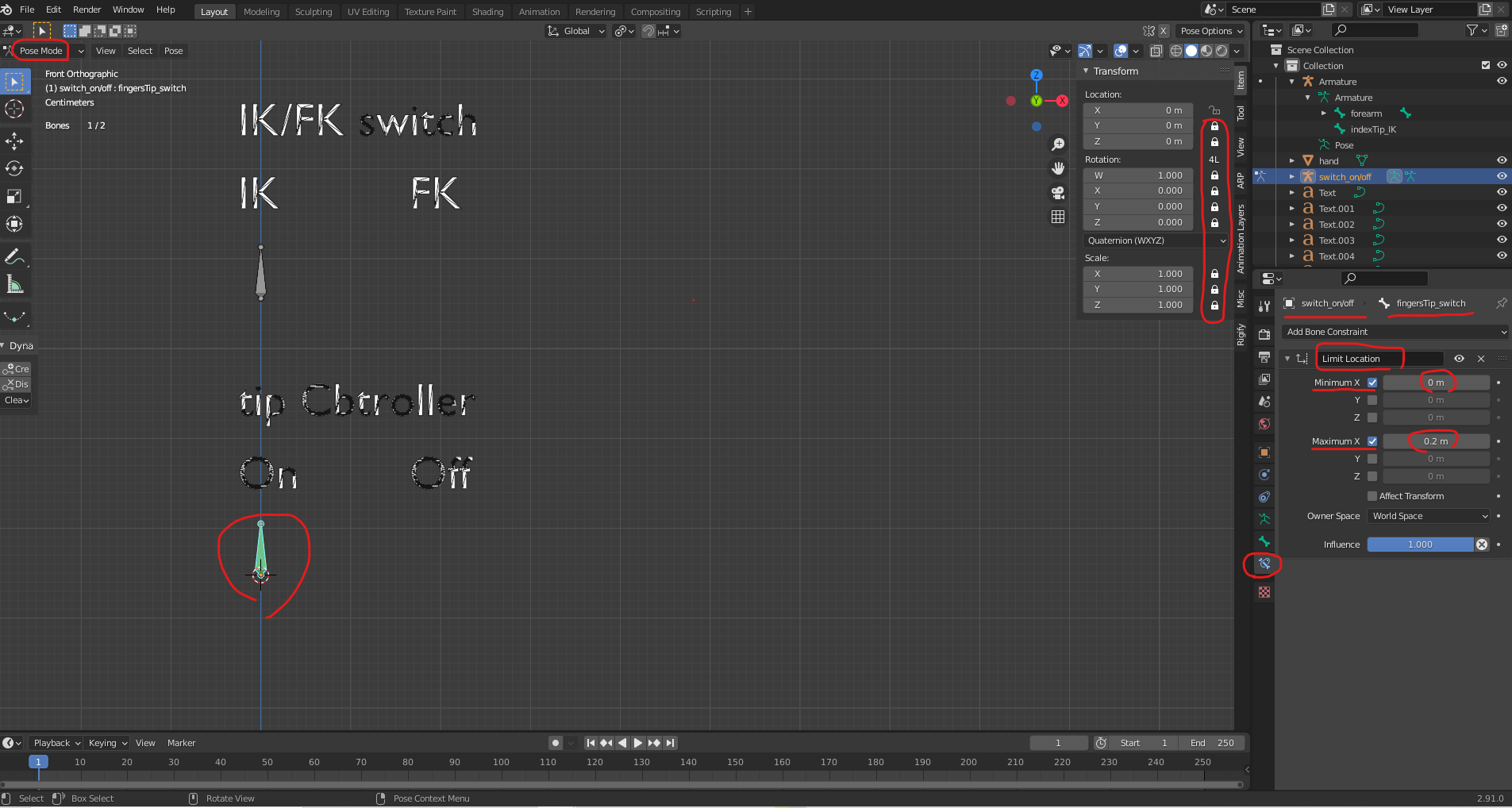 IK/FK_switch 본을 Off 위치에 놓으면 x 값이 0.2 입니다.