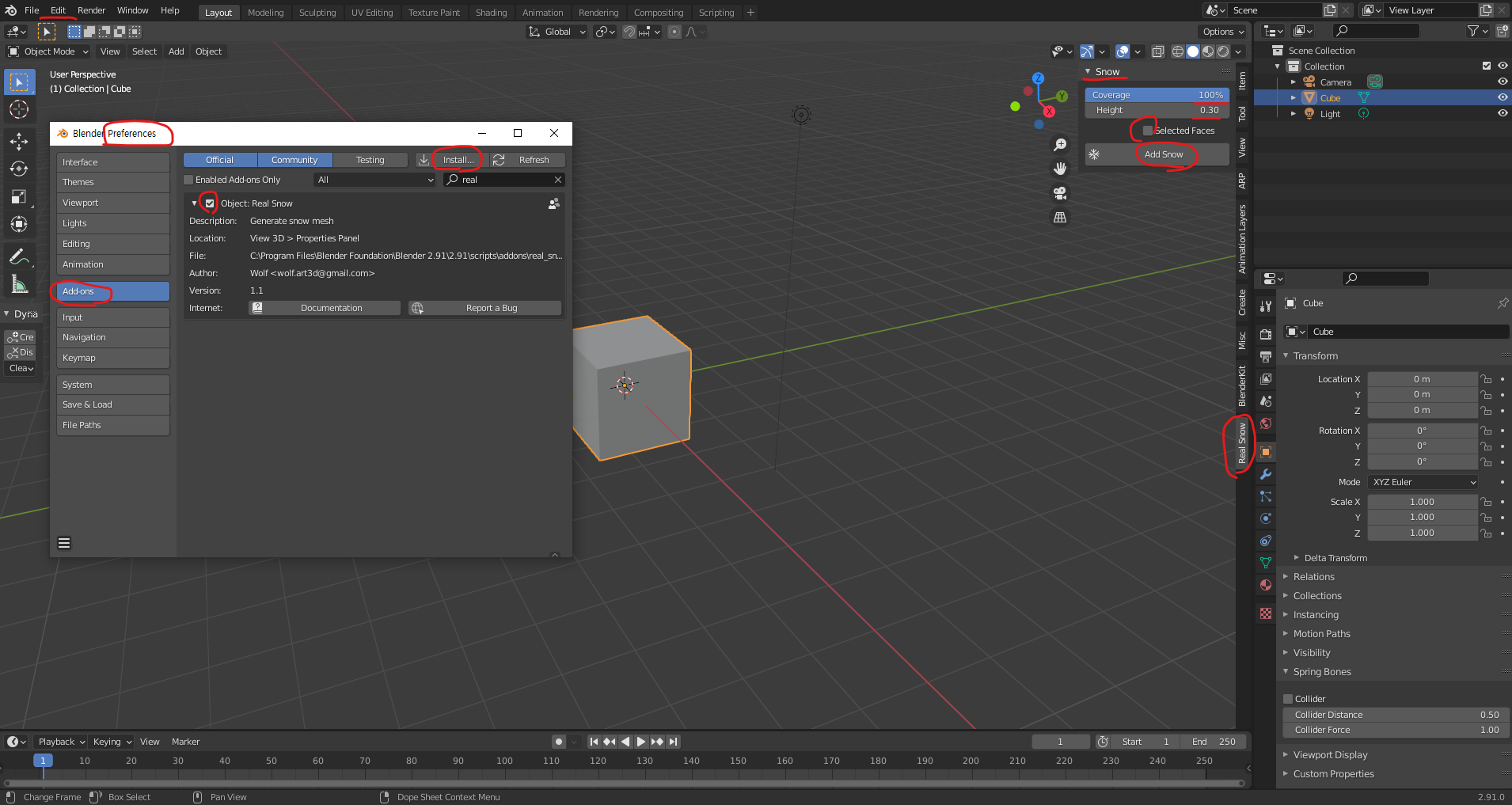 블렌더 강좌 2.91 - 무료 애드온 - Real-Snow - 캐공방TV
