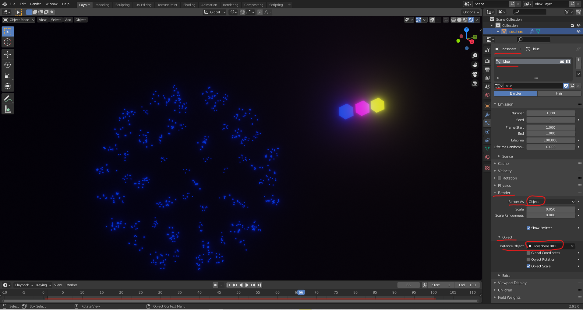 처음에 생성했던 파티클 시스템의 이름을 blue 로 변경하고
