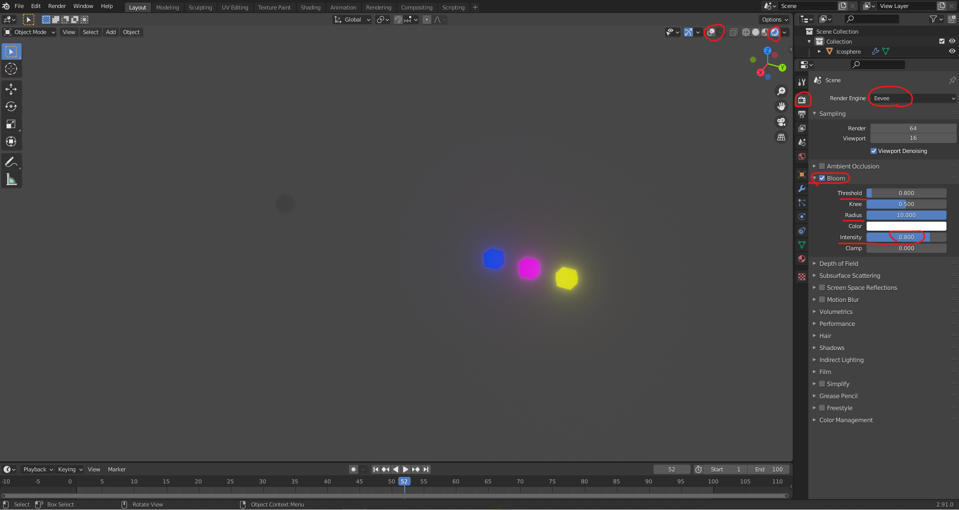 렌더 속성 탭에서 Bloom 을 체크해서 빛이 번지도록 합니다.