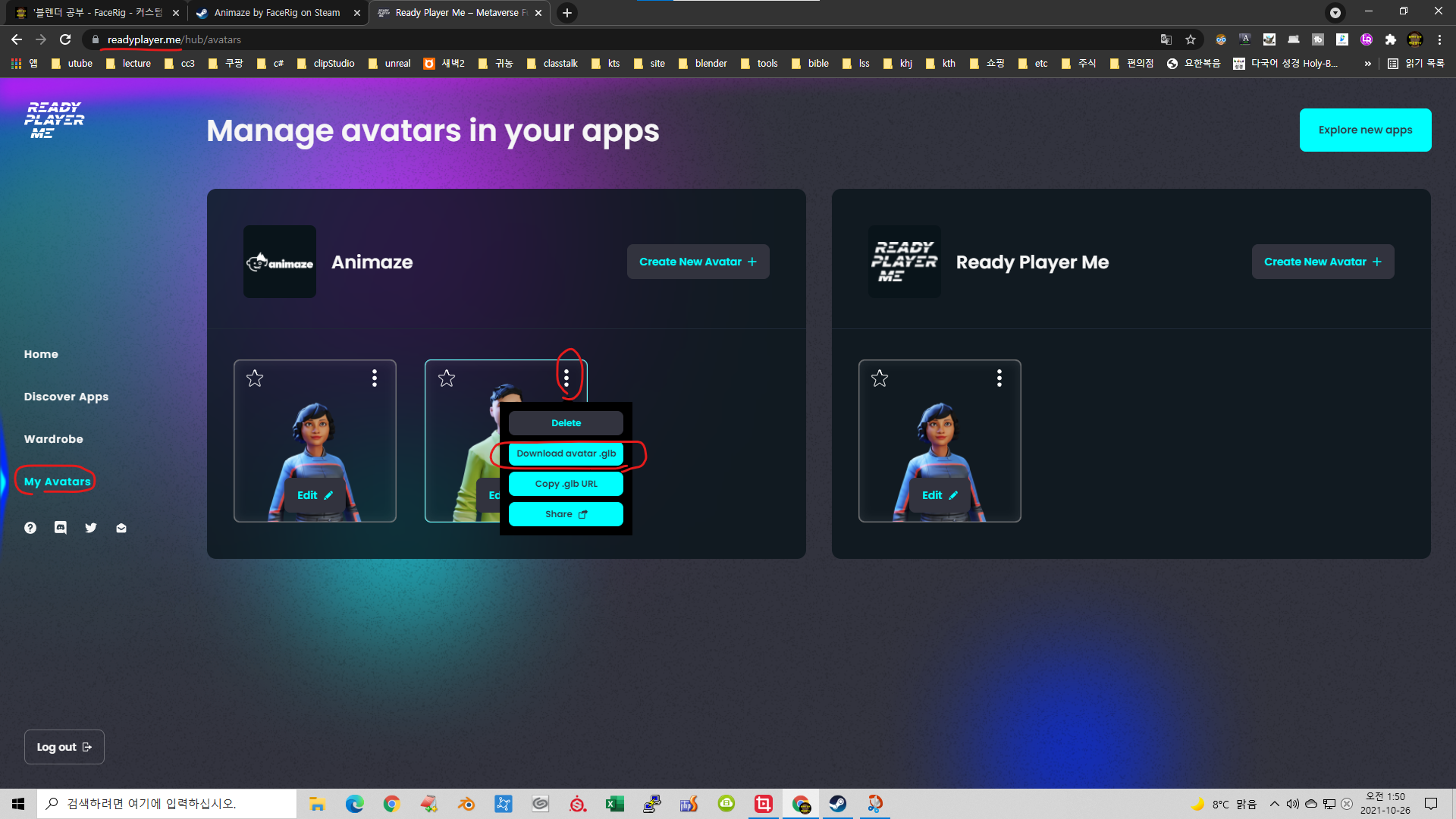 나의 아바타 페이지에서 생성한 캐릭터를 glb 파일로 다운 받아 블렌더로 불러옵니다.