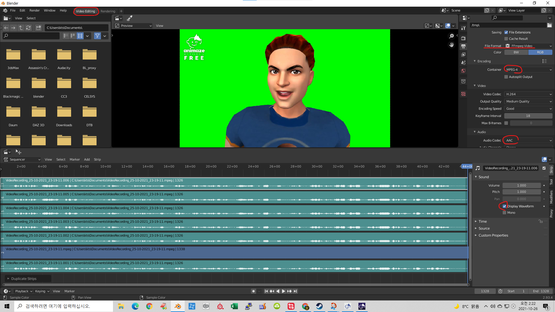 블렌더의 비디오 편집 기능에서 오디오를 여러개 복사해서