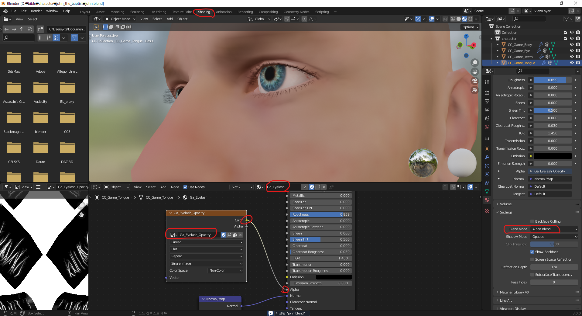 눈썹은 Alpha Blend 가 설정되어 있는 것이 맞습니다.