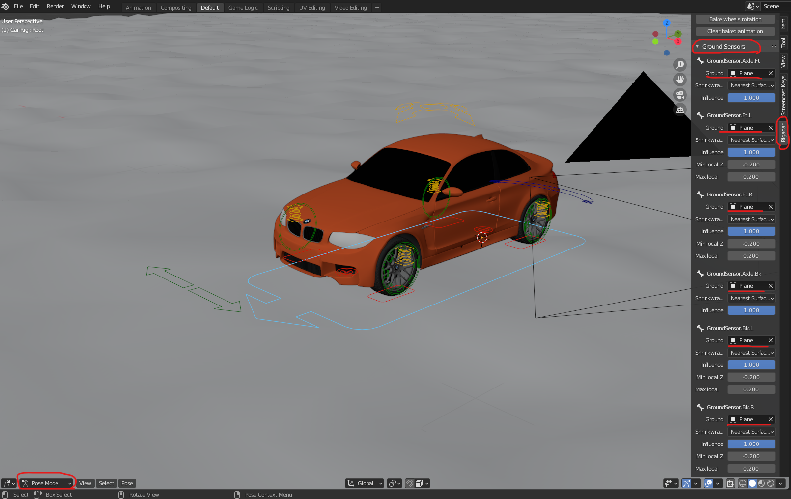 자동차의 컨트롤러를 선택하고 Pose Mode 로 이동합니다.