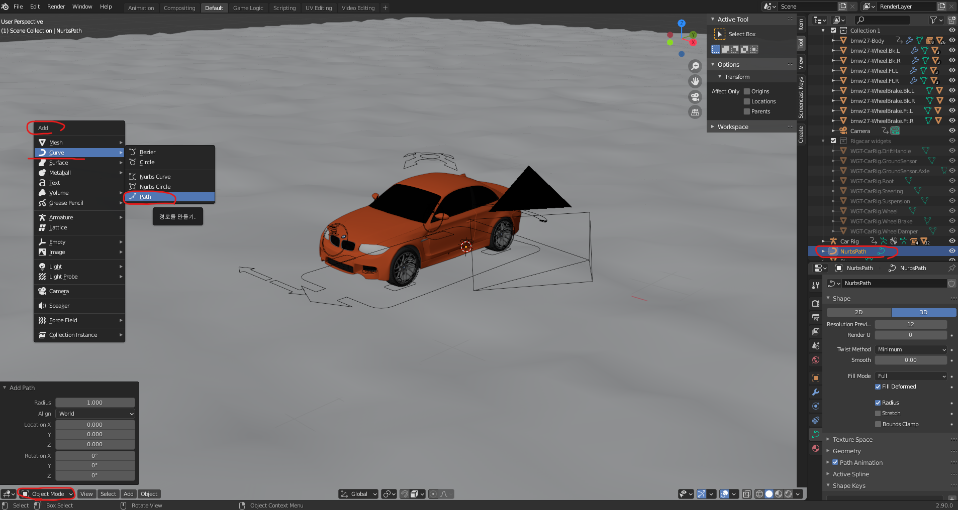 Target 은 자동차의 이동 경로인 Path 를 선택하고
