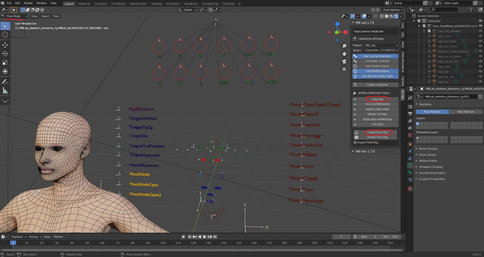 얼굴 표정 컨트롤 본들이 자동 생성됩니다.