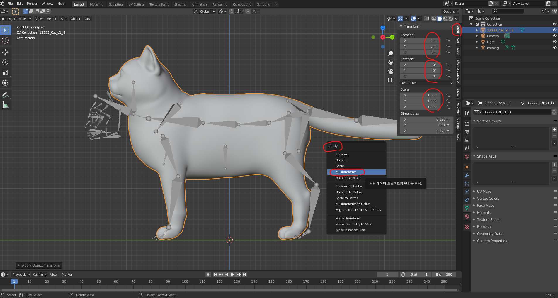 ctrl+a : Apply - All Transforms 를 적용하여 위치, 회전, 스케일 값을 0, 0, 1 로 만듭니다.