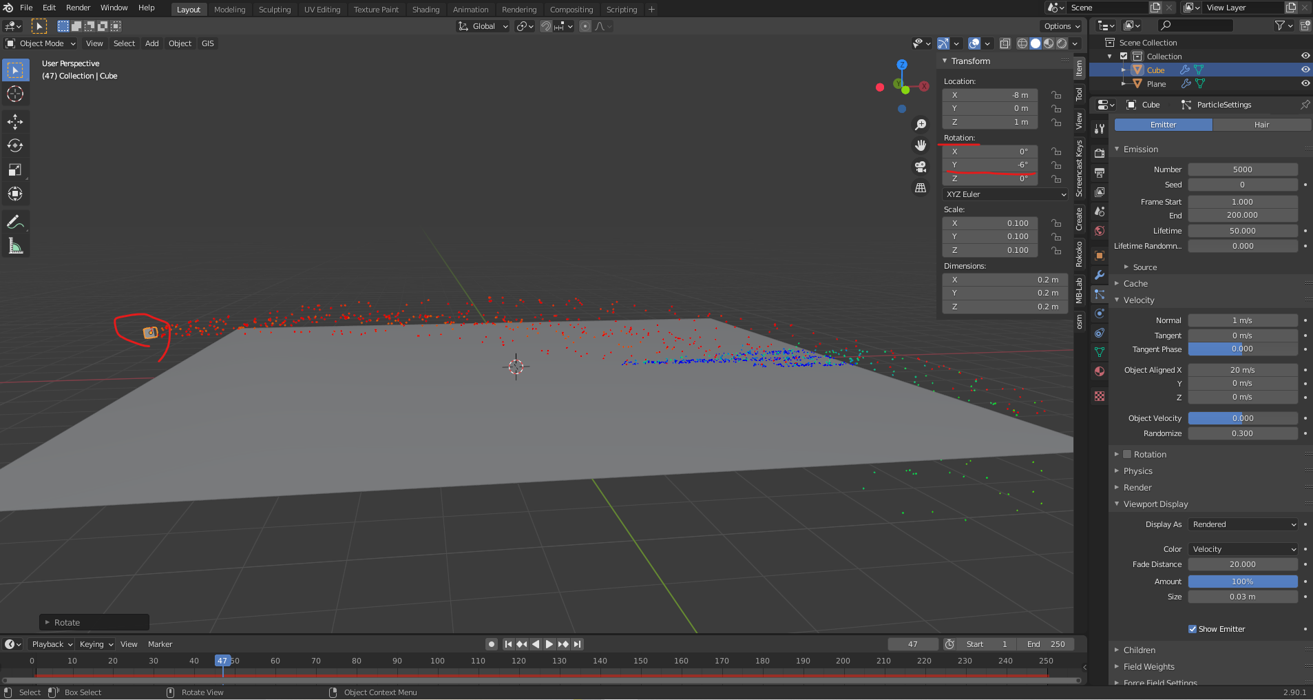 큐브를 y 축으로 회전 하면 파티클의 발사 각도를 수정할 수 있습니다.