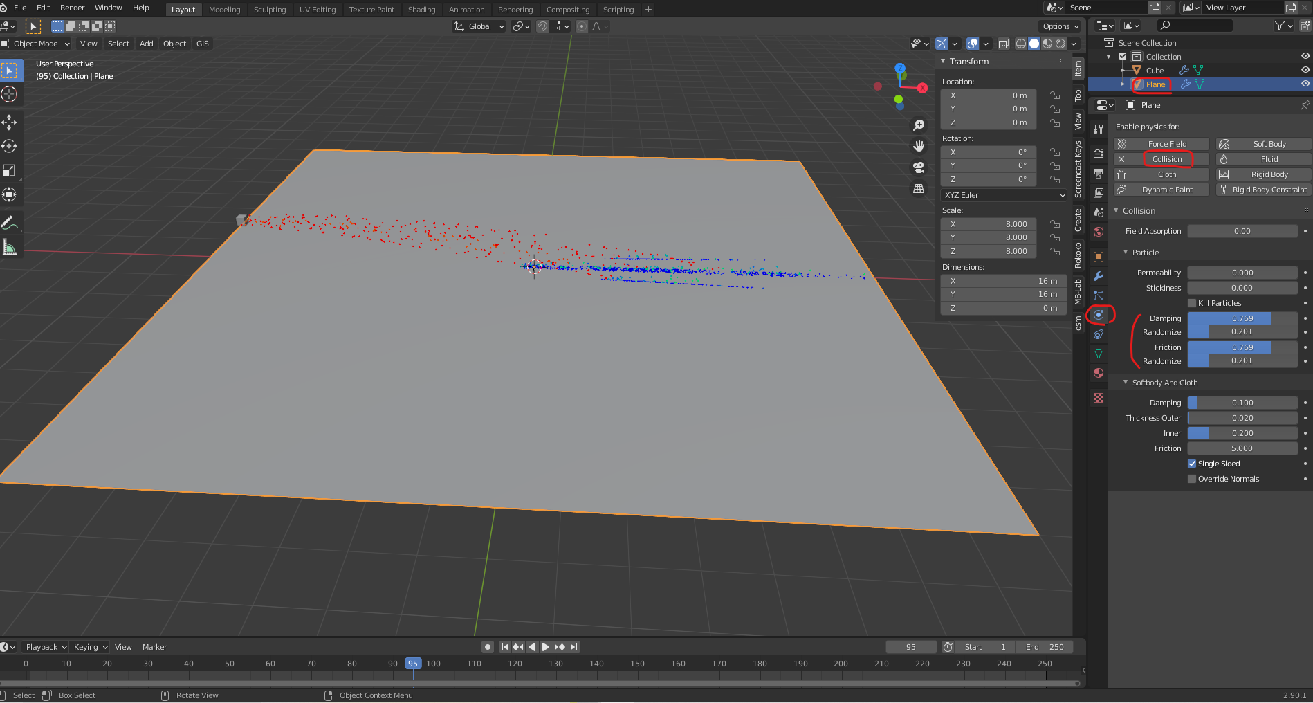 Damping : 0.769 값으로 파티클을 약간 튕기고
