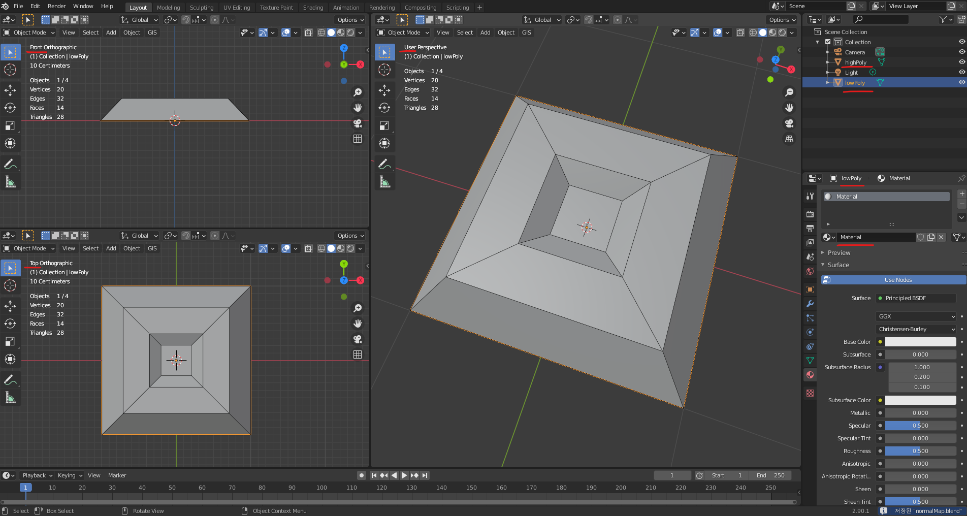 lowPoly는 uv 정보와 재질 정보가 있도록 합니다.