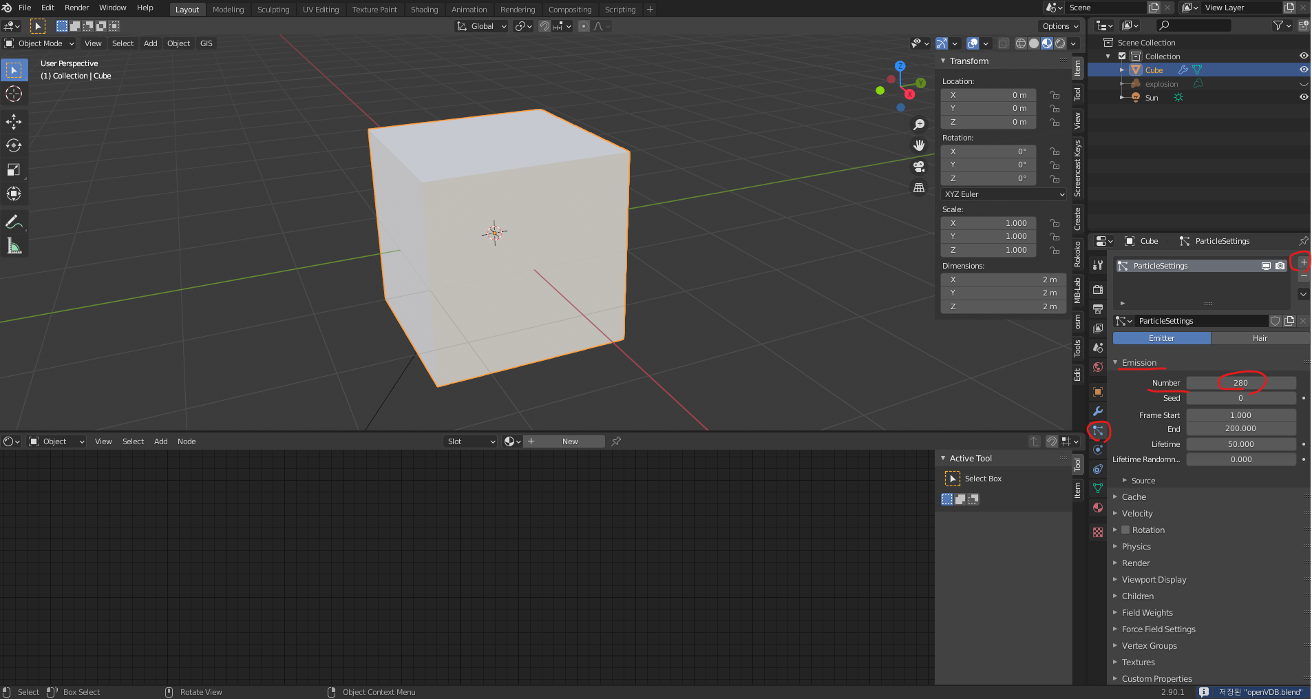 파티클 속성 탭에서 파티클 시스템을 추가하고 Emission Number : 280 으로 합니다.