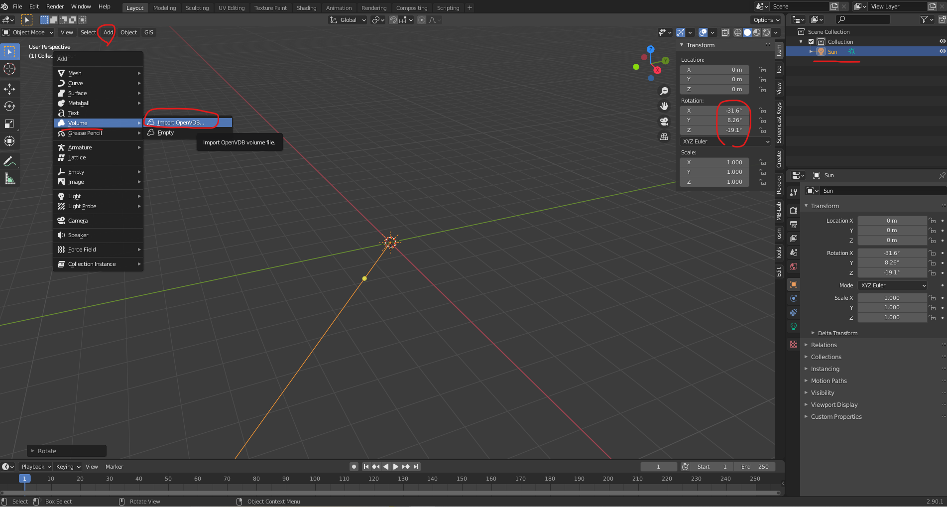 Add - Volume - Import OpenVDB 를 선택해서 explosion.vdb 파일을 불러옵니다.