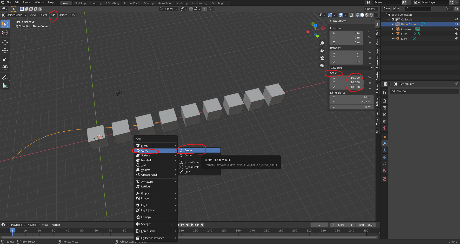 블렌더 강좌 2.90.1 - 커브와 배열을 이용한 오브젝트 배치